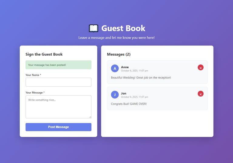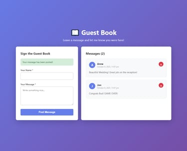 Created a fully functional guest book system where users can post, view, and delete messages. The application stores all data in JSON format, displays timestamps for each entry, generates avatar initials, and provides a clean, intuitive interface. Messages are validated for length and content before storage.
