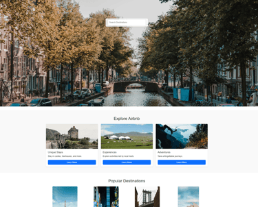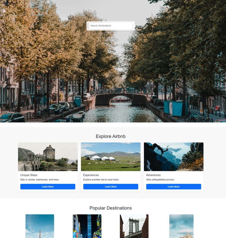 Created a fully responsive landing page inspired by Airbnb’s modern aesthetic, designed to showcase travel destinations, experiences, and accommodations in a visually engaging manner. The page features a full-screen image carousel with destination highlights, a central search bar for quick exploration, and an interactive navbar with login and signup options. Content sections include feature cards for unique stays, experiences, and adventures, a grid layout of popular destinations, and a testimonials carousel for customer feedback. The design incorporates hover effects, smooth scrolling, and lazy loading for improved performance. A clean, mobile-first layout ensures accessibility and usability across devices, while subtle animations and shadows enhance user engagement.