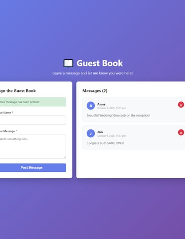 Created a fully functional guest book system where users can post, view, and delete messages. The application stores all data in JSON format, displays timestamps for each entry, generates avatar initials, and provides a clean, intuitive interface. Messages are validated for length and content before storage.