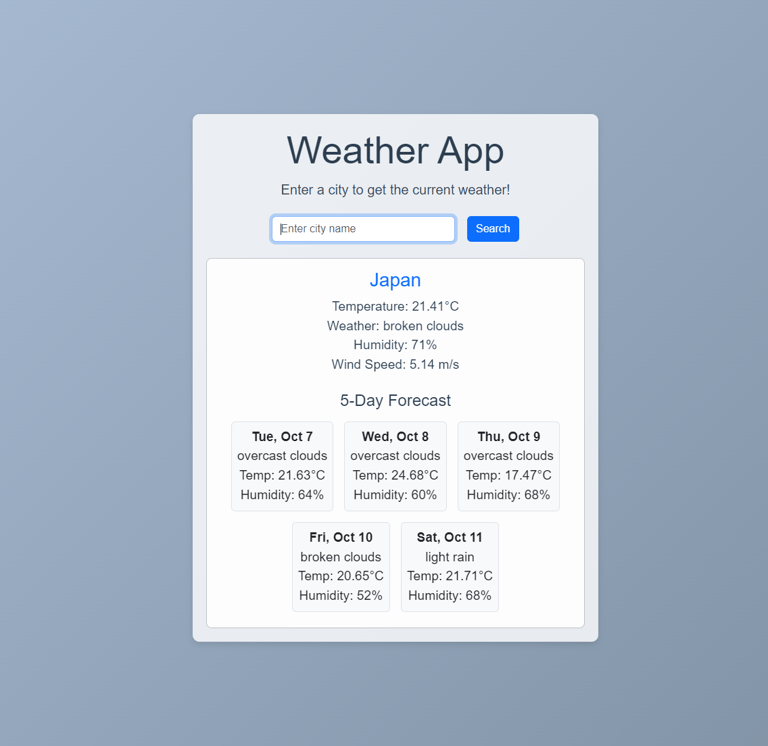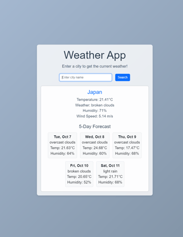 Developed an interactive weather application that retrieves and displays real-time weather data using the OpenWeather API. Users can search for any city to view the current temperature, weather conditions, humidity, and wind speed. The app also provides a 5-day forecast with daily summaries presented in a responsive card layout. It dynamically updates the background color gradient based on current weather conditions (clear, cloudy, rainy, snowy), enhancing user experience with visual feedback. The design ensures responsiveness and accessibility across devices.