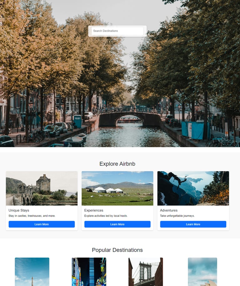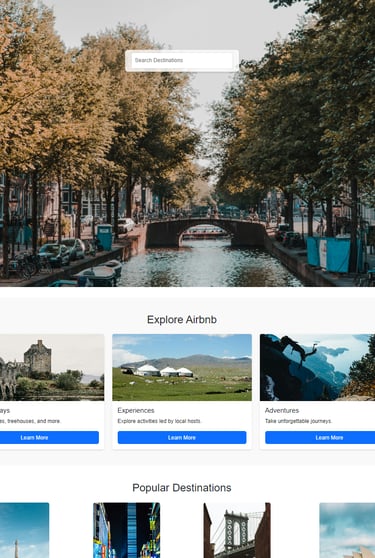 Created a fully responsive landing page inspired by Airbnb’s modern aesthetic, designed to showcase travel destinations, experiences, and accommodations in a visually engaging manner. The page features a full-screen image carousel with destination highlights, a central search bar for quick exploration, and an interactive navbar with login and signup options. Content sections include feature cards for unique stays, experiences, and adventures, a grid layout of popular destinations, and a testimonials carousel for customer feedback. The design incorporates hover effects, smooth scrolling, and lazy loading for improved performance. A clean, mobile-first layout ensures accessibility and usability across devices, while subtle animations and shadows enhance user engagement.